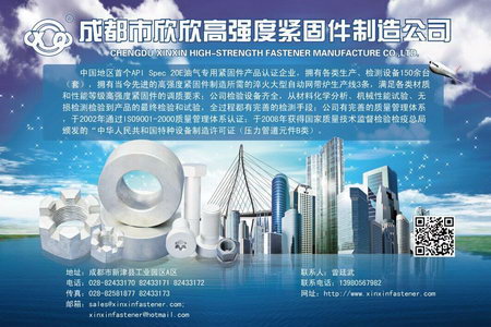 我公司是一家有较大规模的股份制企业,产品覆盖西南三省,出口到东南亚、英国、美国、香港等地,长期为国内多家大型动力机械、冶金、军工、航空厂家配套供货,已成为中国西部地区生产高强度标准件及非标件的知名厂家。我公司生产设备先进,测量、检测设备齐全,拥有一批经验丰富,技术娴熟的生产技术力量,并通过ISO9001-2000国际质量体系认证和美国石油协会API Spec 20E认证。 螺栓 方头螺栓, 沉头方颈螺栓, 沉头带榫螺栓, 半圆头方颈螺栓, 半圆头带榫螺栓, 大半圆头方颈螺栓, 大半圆头带榫螺栓, 六角头铰制孔用螺栓, 六角头螺杆带孔铰制孔用螺栓, 十字槽凹穴六角头螺栓, 六角头螺杆带孔螺栓, 小方头螺栓, T形槽用螺栓, 加强半圆头方颈螺栓, 活节螺栓, 地脚螺栓, 沉头双榫螺栓, 半圆头低方颈螺栓, 六角螺栓(六角头螺栓), 六角法兰面螺栓. 螺母(螺帽) 方螺母, 六角螺母, 六角厚螺母, 蝶型螺母, 环型螺母, 组合式盖形螺母, 球面六角螺母, 扣紧螺母, 滚花高螺母, 滚花薄螺母, 小六角特扁细牙螺母, 嵌装圆螺母, 小圆螺母, 圆螺母, 端面带孔圆螺母, 侧面带孔圆螺母, 带槽圆螺母, 非金属嵌件六角锁紧螺母, 盖型螺母, 六角薄螺母, 六角开槽螺母, 六角开槽薄螺母, 非金属嵌件六角法兰面锁紧螺母, 全金属六角锁紧螺母, 全金属六角法兰面锁紧螺母, 六角开槽薄螺母, 焊接方螺母, 焊接六角螺母.热线电话:18011443593 18011444593