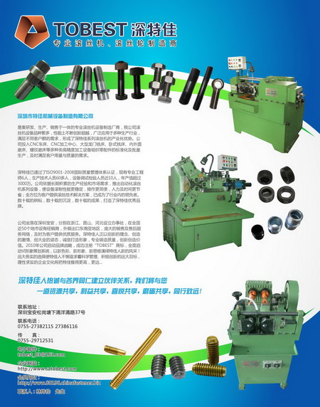 深圳市特佳机械设备制造有限公司是集研发、生产、销售于一体的专业滚丝机设备制造厂商,我公司滚丝机设备品种繁多,性能上不断创新超越,广泛应用于多种生产行业,满足不同客户群的需求,形成了深特佳系列滚丝机的产业化优势。 公司投入CNC车床、CNC加工中心、大型龙门铣床、卧式铣床、内外圆磨床、螺纹磨床等多种类高精度加工设备组织零配件的标准化及批量生产,及时满足客户用量与质量的需求。 深特佳已通过了ISO9001-2008国际质量管理体系认证,现有专业工程师6人,生产技术人员60多人,设备调试检验人员近10人,年产值超过3000万。公司依据长期积累的生产经验和市场需求,推出自动化滚丝机系列设备,使设备滚制性能更稳定,操作更简便,人力及时间更节省;全方位为客户提供滚丝技术解决方案,已成为了行业内的领先者。 数十载的耕耘,数十载的沉淀,数十载的成果,打造了深特佳优秀品牌。公司坐落在深圳宝安,分别在浙江、昆山、河北设立办事处,在全国近50个地市设有经销商,外销出口东南亚地区,庞大的销售及售后服务网络,及时为客户提供优质服务。 深特佳人正以创新的理念、创造的激情、创大业的姿态,诚信打造形象,专业铸造质量,创新创造价值。2010年公司启动品牌战略,成功注册“TOBEST”商标,全面启动VI形象策划系统,以新色彩、新形象、新思维演绎特佳人新的风采!远大务实的选择使特佳人不懈追求着科学管理、积极创新的远大目标,理性求实的企业文化将把特佳推得更高,更远... 深特佳人热诚与各界同仁建立伙伴关系,我们将与您一道资源共享,利益共享,喜悦共享,磨砺共享,同行致远!