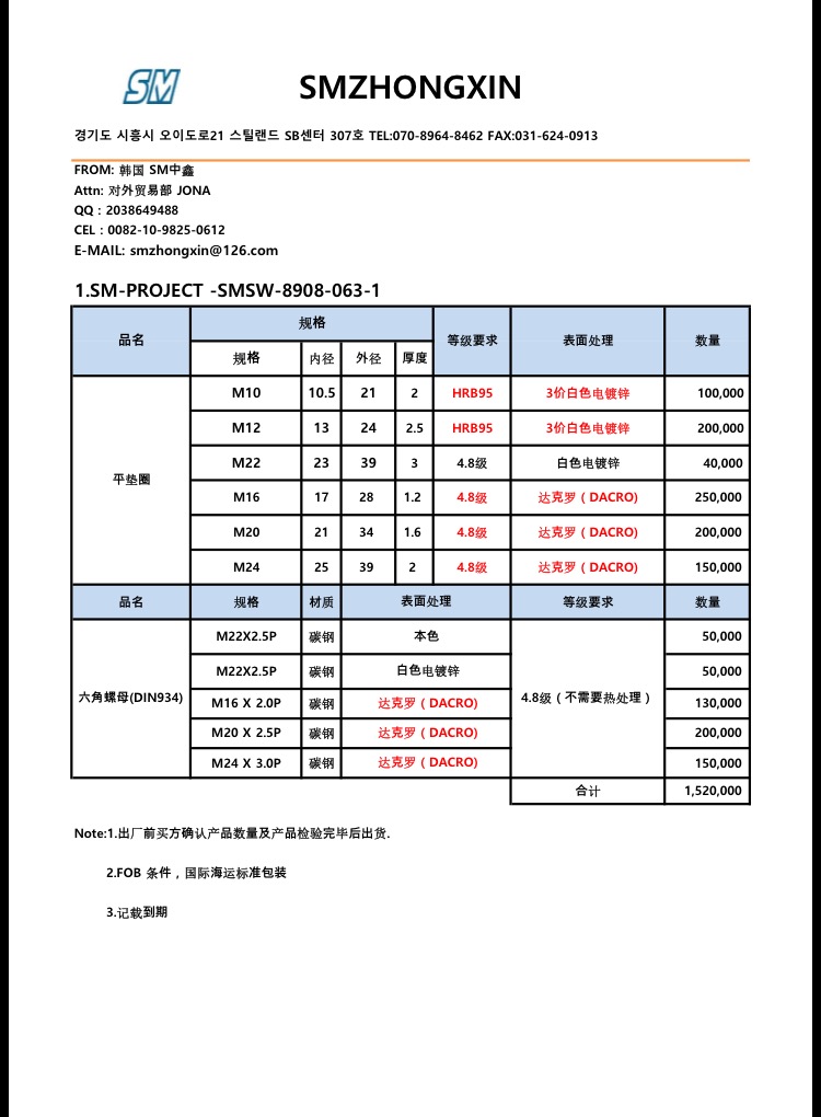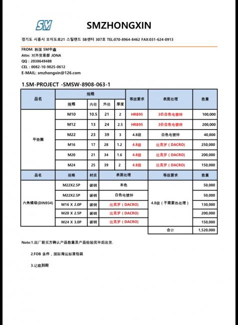 你好 我是韩国SM中鑫采购部的jona。 感谢阅读我的询价单。我的QQ 2038649488 有什么问题请发邮箱至smzhongxin@126.com 希望有机会合作。 www.smfasteners.co.kr