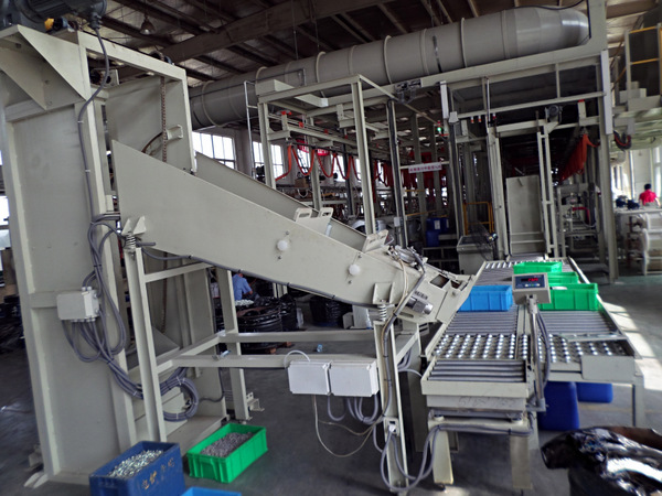 6)此款新设备可以实现连续化作业,自动化程度更高。只有在滚桶上料位、滚桶下料位及钝化后最终成品下料位有操作人员,其余不同形式设备之间的连接全部通过自动化方式进行。