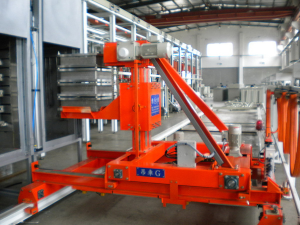 2)设计了一套三向动作的吊车来搬运炉内的工件(此三向吊车已申报了发明专利)。这一设计比传统的结构更优化,也省去了一台搬运吊车。三向吊车是可以朝前后、左右和上下三个方向动作的搬运车,它可以完成两台吊车的工作量。前后方向的运动是用来实现将堆栈好的承盘搬运到去氢炉、冷却炉或分层机构上(不同的位置均有不同的地址编码);左右运动是用来将承盘取出或放入炉内;上下动作是用来实现篮子的抓取和迭放的功能。