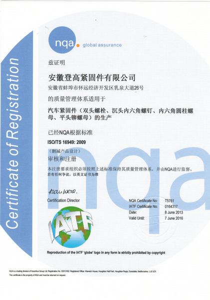 | 核心提示: 记者近日从安徽登高紧固件有限公司获悉,该公司今年成功通过ISO/TS16949:2009技术规范的认证,认证范围涉及双头螺栓、沉头内六角螺钉、内六角圆柱螺母、平头铆螺母等产品的生产及制造,标志着安徽登高在汽车配套领域迈上了一个崭新的台阶。