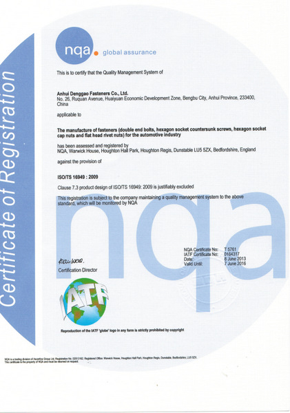 金蜘蛛网讯 记者近日从安徽登高紧固件有限公司(http://85619v.chinaFastenerinfo.com/)获悉,该公司今年成功通过ISO/TS16949:2009技术规范的认证,认证范围涉及双头螺栓、沉头内六角螺钉、内六角圆柱螺母、平头铆螺母等产品的生产及制造,标志着安徽登高在汽车配套领域迈上了一个崭新的台阶。