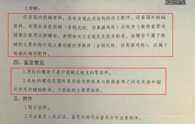 除此之外,马建还向记者提供了一份由西南政法学司法鉴定中心出具的鉴定意见书,鉴定事项为“五金配件铁头子螺母是否是国内制式枪支主要零配件”。鉴定意见书显示,送检的螺母不是中国制式枪支的零部件,是国外某些枪支的枪身与散热套筒之间起连接和固定作用的辅助配件,不是枪的主要零部件。