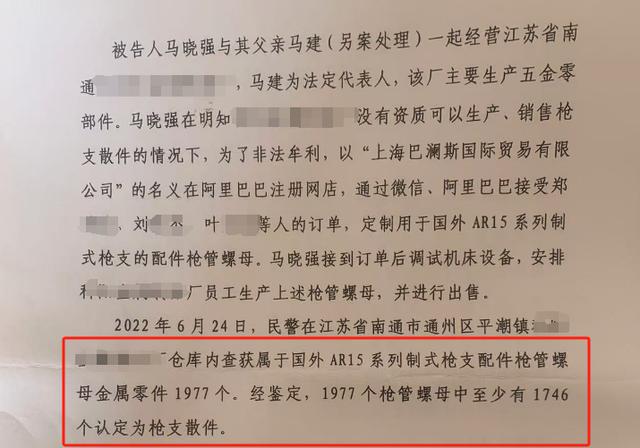 起诉书内容显示,马晓强在明知金属制品厂没有资质可以生产、销售枪支散件的情况下,接受他人订单,安排员工生产国外AR15系列制式枪支的配件枪管螺母。