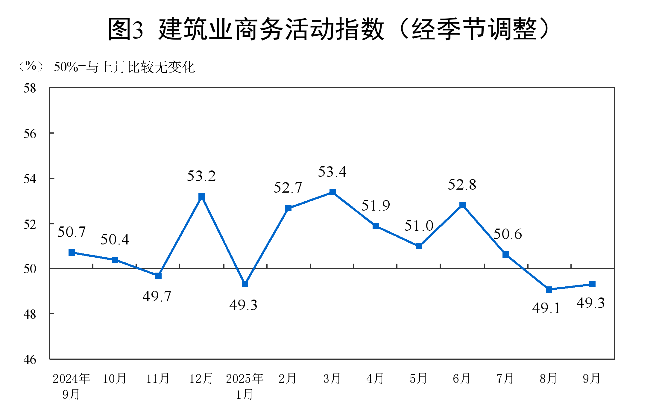 9月份,非制造业商务活动指数为50.0%,比上月下降0.3个百分点,位于临界点,非制造业业务总量总体稳定。