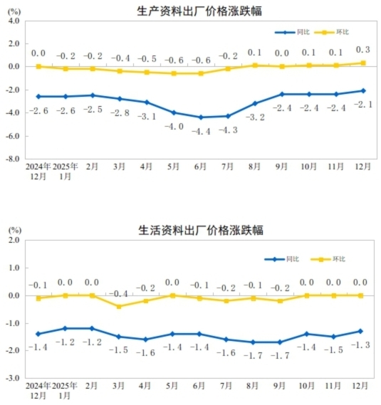 2025年12月份,全国工业生产者出厂价格同比下降1.9%,降幅比上月收窄0.3个百分点;环比上涨0.2%,涨幅比上月扩大0.1个百分点。工业生产者购进价格同比下降2.1%,降幅比上月收窄0.4个百分点;环比上涨0.4%,涨幅比上月扩大0.3个百分点。2025年全年,工业生产者出厂价格下降2.6%,工业生产者购进价格下降3.0%。