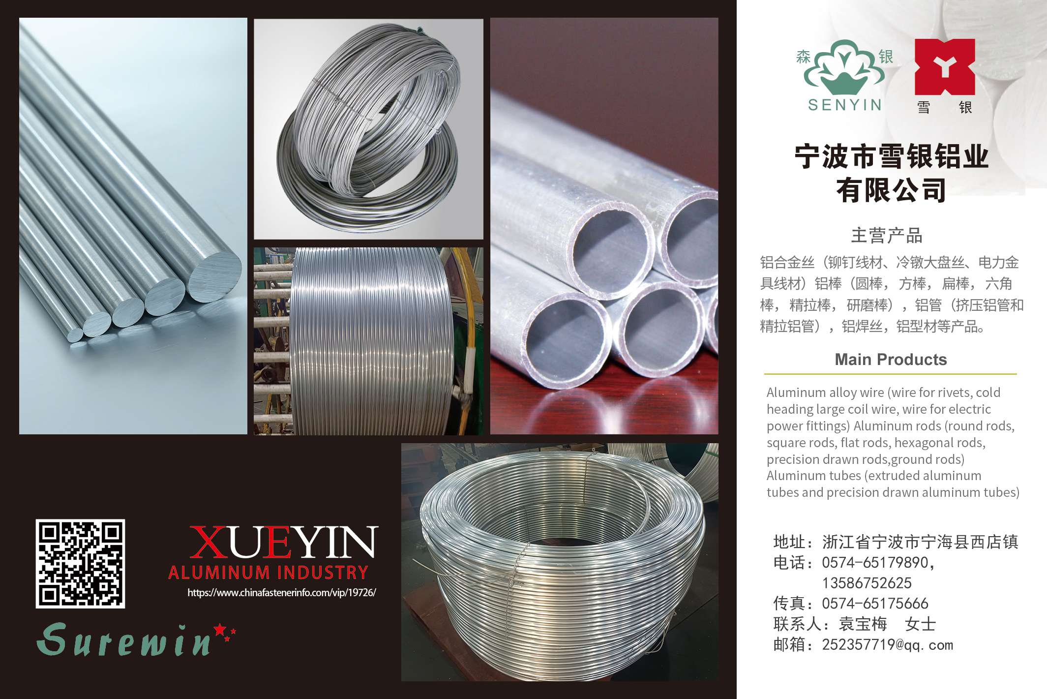 成立日期:1990 员工人数:200 注册资本(元):668万 年营业额(元):9000万 宁波市雪银铝业有限公司自1990年创办以来,坚持团结拼搏,开拓求实,满足用户,科技进步的企业精神。并于2000年已通过了ISO9001质量体系认证, 2020年通过16949 汽车质量管理体系认证。公司拥有固定资产净值3000万元,厂区占地面积3万平方米,建筑面积2万平方米,现有职工200人,其中工程技术人员50人。 专业生产5056 、5052、 5050、6061、 6063 、6082,LF10 、LY11、1060、1100, 1070,5356 、7005,7009,7075, 2011、2017、2A01 2024、3003、5754、5154、5005、6011、6010,7A03等合金铝丝、A00钝铝丝、电缆线丝、毛线针丝、拉链扁丝,精拉铝棒及工业用高强度大铝棒(圆棒,方棒,异形棒)与工业用型材,产品主要用于:工艺、体育、健美、衣架、散热器、装潢、船舶、灯具、汽车、电子器材、机械配件、电器配件等各行业配套,产品可进行踏、扁、弯、缩、涨、卷等工艺。其中自行开发的LY12、LY8特硬棒,铝焊条丝处于行业优势地位。生产的铝线规格从1.0mm--30.0mm , 15MM以上规格,每件重量200公斤 到500公斤之间, 适合多工位冷墩机冷墩, 给客户节省材料和时间。 我公司依靠强大的技术实力,以优质的产品,优良的服务,来赢得客户的推崇。我们将以“务实品质,引领行业先锋。开拓进取,实现持续发展”为宗旨,竭诚为广大用户服务。