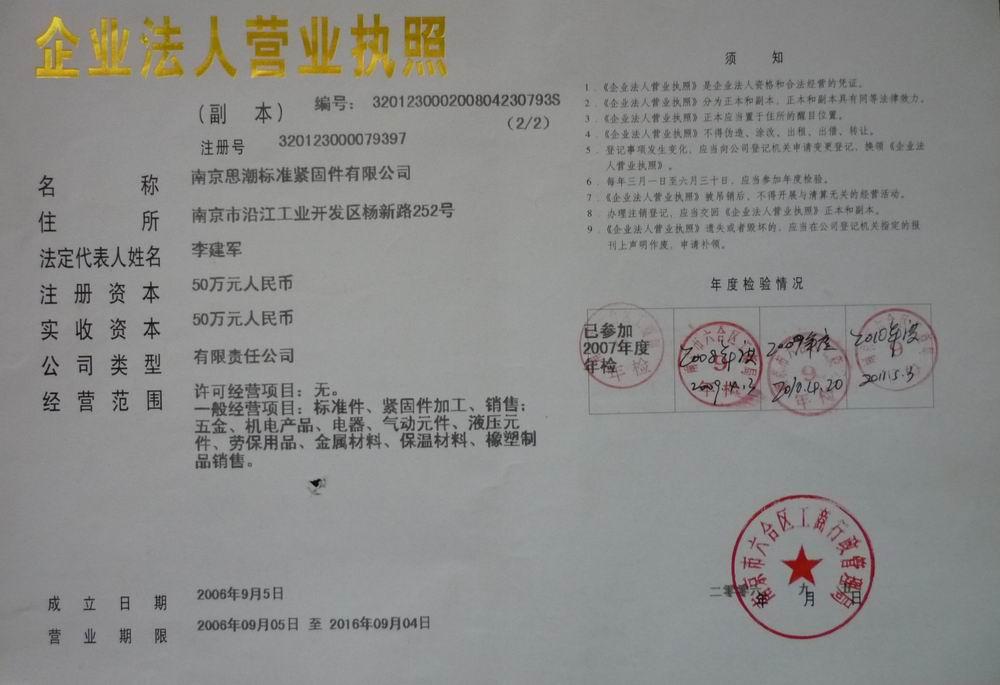 南京思潮标准紧固件有限公司坐落于风景秀丽,虎踞龙盘的六朝古都南京市沿江经济技术开发区内,专业从事GB(国标)、ANST(美标)、DIN(德标)、JIS(日标)等各类标准的高品质、高精度的不锈钢、碳钢、铜、尼龙塑料等多种材质的螺钉、螺母、垫圈等各种标准件、紧固件的研发、生产与销售。产品主要服务于:仪器仪表,精密电子,电器,通讯设备,手表,玩具,家俱,眼镜,交通工具,机械设备等多种行业。 螺丝虽小,安全事大。思潮公司一贯注重产品质量。公司拥有一支技术精湛,经验丰富的科研队伍,所引进的台湾冷墩机、搓丝机均是目前东南亚地区较先进的设备,在吸收国内外先进技术的基础上,本着科技第一、质量第一、服务第一、信誉第一的宗旨,全力为客户提供最优秀的产品及最满意的服务。目前思潮螺丝在广大用户中享有很好的口碑,在国内的市场上一直占据重要的位置。 为了能够更好的保证产品质量,思潮公司备有硬度机、拉力机、投影仪、镜像室、分厘卡、游标卡尺、环规以及测深规等多种检测设备和工具,且均为先进的名厂家所制造,努力实现产品质量的高标准和零缺陷要求。 思潮人时刻倾听着您的宝贵建议和意见,我们将始终秉承“以质量为生命,以服务树信誉”的企业精神,本着“一切以用户为中心,与用户共发展”的经营理念,期待着与您精诚合作,携手并进,共创辉煌!
