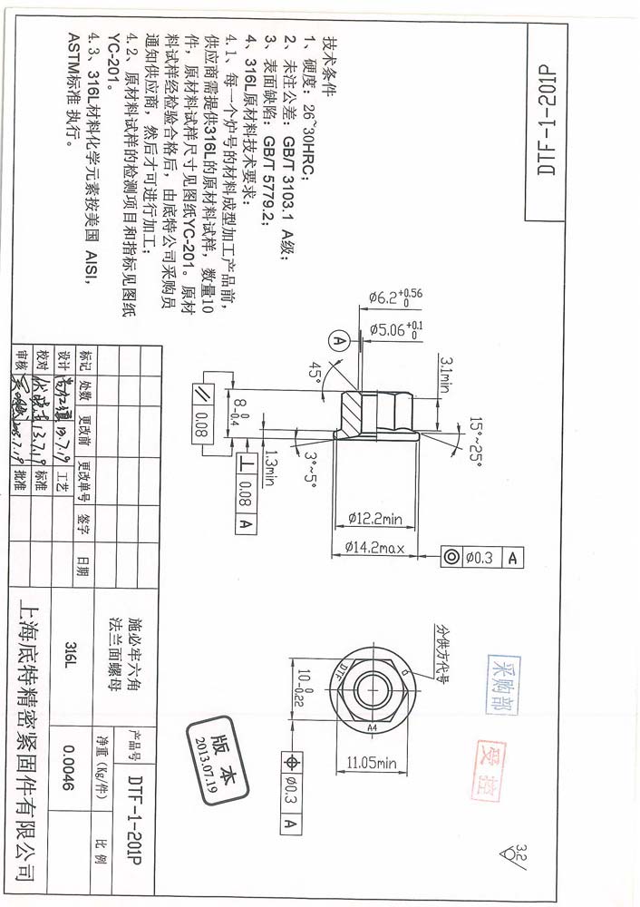 品名/标准号:企业标准 型号:M6 数量:至少年用量80万 要求:原材料需用宝钢的,尺寸规格见图纸