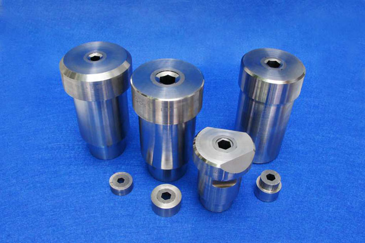 六角六片模于压制前预先沿六角对边方向切割分作六片,经镜面式抛光后紧配压入模壳内成型。有效去除了因六角产生的应力集中,避免了六角模因应力集中而易爆裂的现象,加上六片模抛光工艺更精细,从而使六片模获得比六角模高出五倍以上的使用寿命。