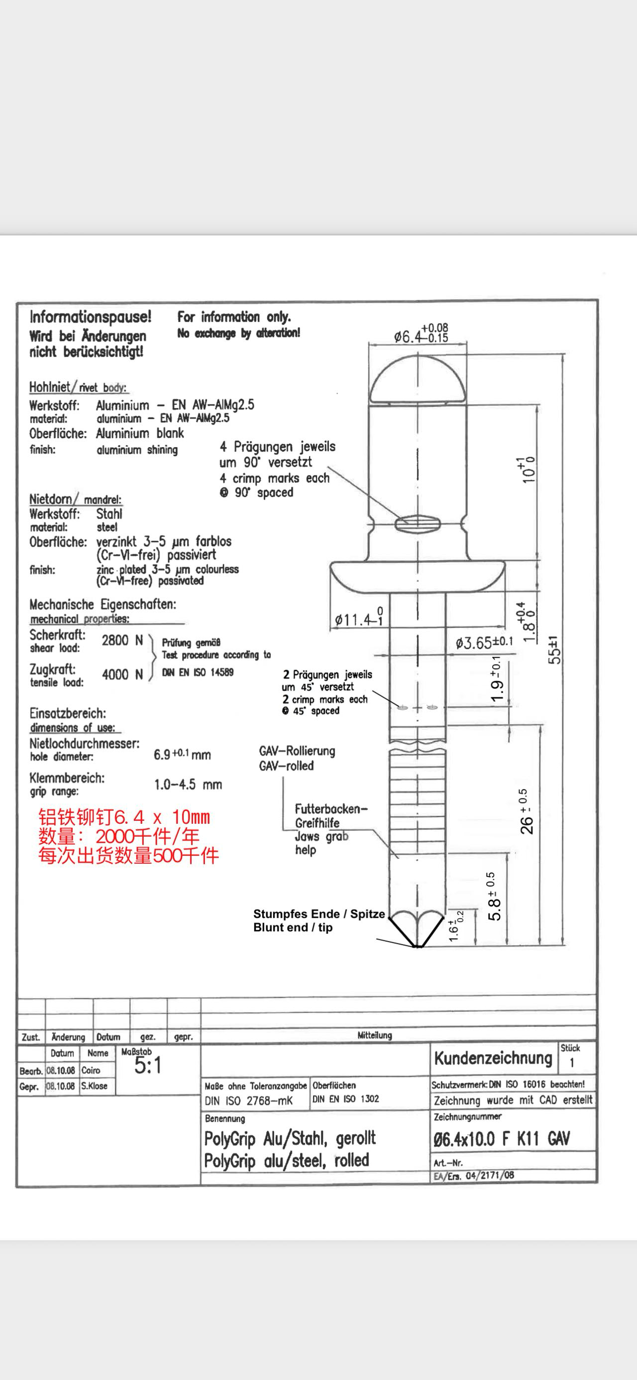 产品分类:其他 产品名称:铝铁抽芯铆钉 产品规格:6.4 X 10 产品数量:2000000 产品材质:铝+铁 表面处理:镀锌3-5um 检测设备:光选机 请生产厂家报含税运到港口仓库的价格。
