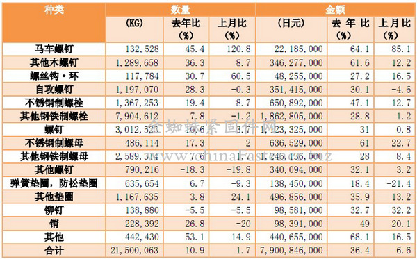| 核心提示: 2013年9月日本进口紧固件总量为21,500吨,同比增长10.9%,环比增长1.7%;进口额为790,084.6万日元,同比增长36.4%,环比增长6.6%。