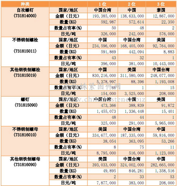 金蜘蛛网讯(@金蜘蛛紧固件网官方微博) 日本财务省贸易统计数据显示,2013年9月日本进口紧固件总量为21,500吨,同比增长10.9%,环比增长1.7%;进口额为790,084.6万日元,同比增长36.4%,环比增长6.6%。主要进口来源地为中国大陆、美国和中国台湾。