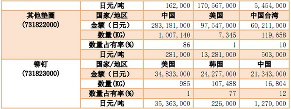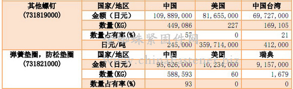 2013年9月日本紧固件进口概况及大宗进口国排名