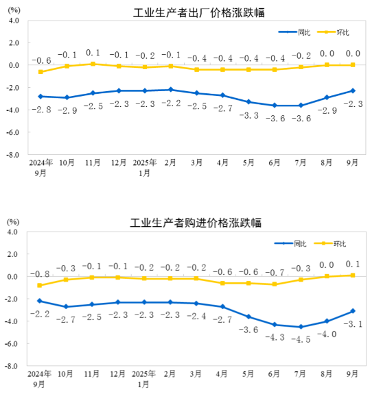 2025年9月份,全国工业生产者出厂价格同比下降2.3%,降幅比上月收窄0.6个百分点,环比继续持平。工业生产者购进价格同比下降3.1%,降幅比上月收窄0.9个百分点,环比上涨0.1%。1—9月平均,工业生产者出厂价格比上年同期下降2.8%,工业生产者购进价格下降3.2%。