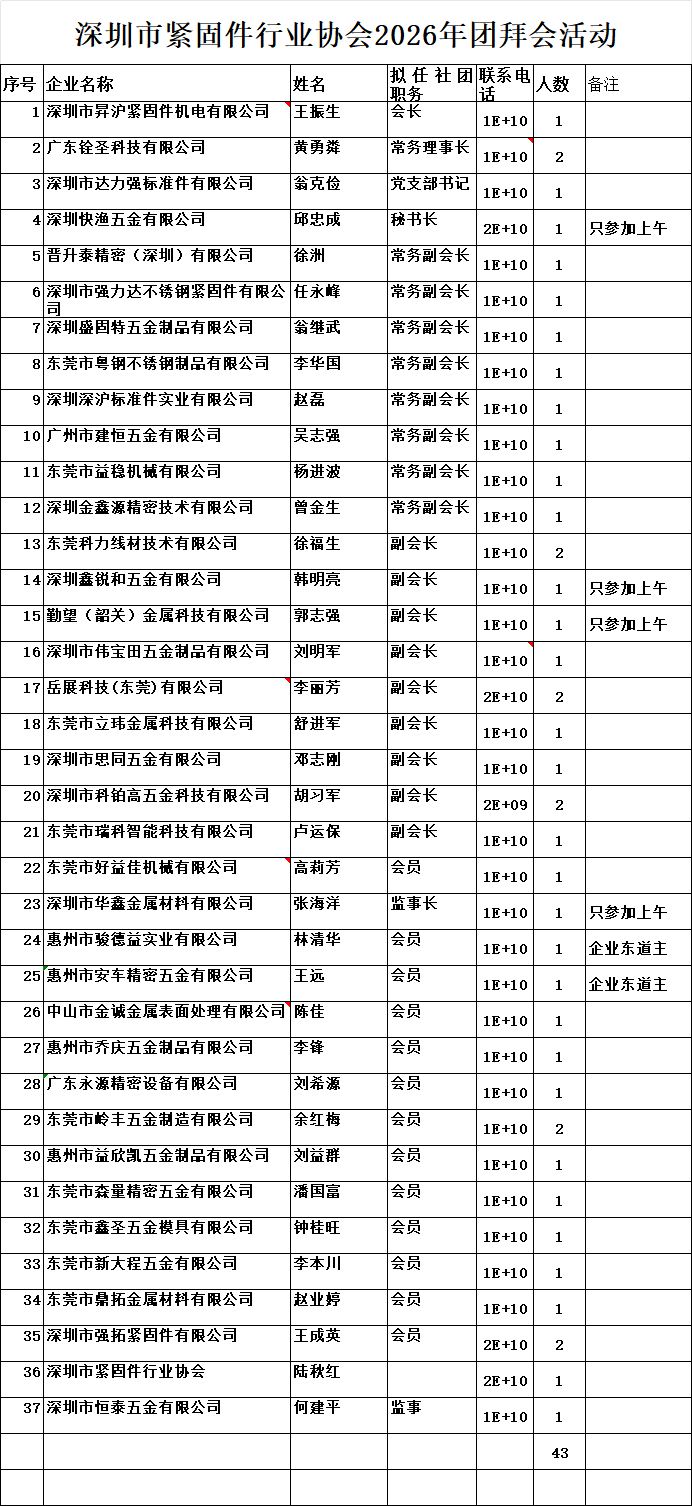 2026 年是充满机遇与挑战的一年,也是协会换届承前启后的关键之年。站在新的起点上,深圳市紧固件行业协会将继续秉持 “服务会员、赋能产业、链接资源、共谋发展” 的宗旨,在王振生会长的带领下,团结全体会员企业,以 “紧固并进” 的姿态,深耕实业、锐意创新,为推动中国紧固件产业高质量发展贡献深圳力量!