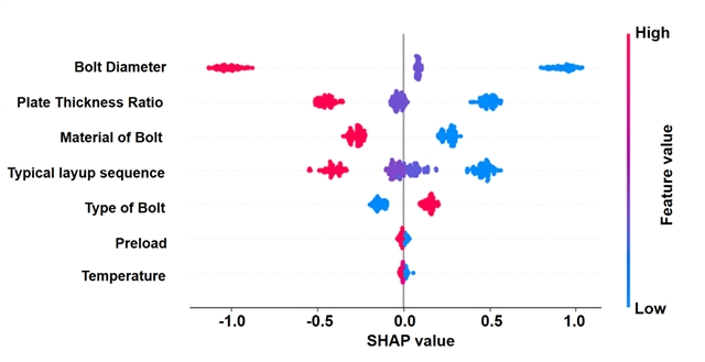 本文利用参数化有限元数据结合随机森林算法,成功开发了金属-复合材料连接结构紧固件柔度的高精度快速预测工具。研究创新性地运用SHAP可解释性理论,不仅透明化了机器学习的决策路径,还从材料力学的底层逻辑出发,系统阐明了多参数耦合作用下连接刚度的演化规律。这些发现不仅证实了AI技术在多参数耦合非线性问题中的可靠性,也为未来复合材料接头的智能化设计、材料选型及载荷分配计算提供了高效工具与指导依据。