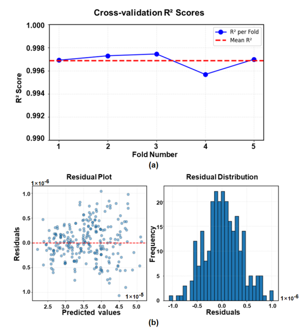本研究首先通过Python-Abaqus二次开发技术构建了参数化有限元模型,系统开展了参数化分析。研究提取了涵盖紧固件直径、板厚比、铺层比例、紧固件类型(凸头/沉头)、紧固件材料、预紧力以及环境温度等7类关键变量,通过全因子设计共计生成了864组具有代表性的高质量柔度数据。经对比,有限元模型的计算值与试验值的相对误差控制在了3.52%以内,确保了数据源的高度可靠性。在此基础上,研究团队对数据进行了Z-score标准化及独热编码预处理,建立了基于随机森林(RF)算法的柔度预测模型,取得了以下显著成果:极高的预测精度与效率:训练完成的随机森林模型在独立测试集上的决定系数(R²)达0.9968,均方误差(MSE)仅为0.0033。相比于传统有限元单次仿真耗时约90分钟,该模型完成单次预测仅需0.02秒,在维持高可靠性的前提下极大地提升了计算效率。卓越的模型稳健性与泛化能力:通过五折交叉验证机制,各折测试的决定系数均稳定在0.995以上,且预测误差呈现出显著的以零为均值的正态分布特征。这证明模型具有出色的抗噪能力,无明显的系统性偏差。