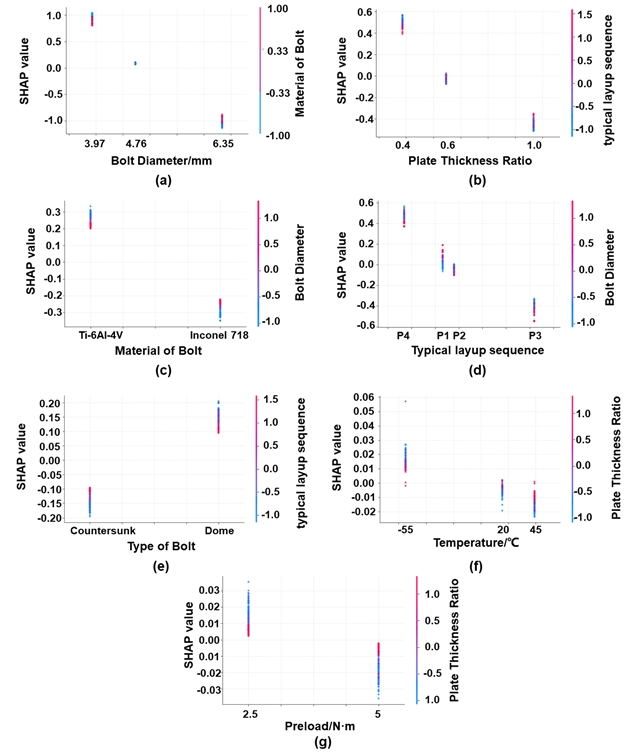 为解决集成学习模型的“不可解释性”痛点,作者进一步利用TreeSHAP算法量化了各特征对最终预测结果的贡献度,并将其与单剪接头紧固件柔度理论解析公式进行了深度的力学交叉验证:核心影响因素精准识别:SHAP全局分析表明,紧固件直径是对接头柔度影响最为显著的核心特征,其次是板厚比。紧固件材料、铺层顺序以及紧固件类型具有中等程度的影响力,而预紧力与环境温度的独立贡献在全局权重中几乎可以忽略不计。预测逻辑与力学机制的印证:模型的预测规律与经典力学公式完美契合。直径增大可显著减小剪切、弯曲及挤压柔度;当板厚比接近1.0时,由于紧固件变形以剪切为主且二次弯矩可忽略,柔度达到最小;埋头钉(沉头钉)由于缺乏钉头的弯矩约束及几何不连续性,相比凸头钉会显著增大连接部位的局部柔度。揭示多参数非线性耦合效应:研究深入分析了复杂的特征交互作用。例如,增大紧固件直径可以有效抵消由特定铺层引起的刚度退化;虽然沉头配置会增加柔度,但其负面影响可以通过优化铺层顺序来缓解;而钛合金的柔度特性在小直径范围内表现得更为突出。这些复杂的非线性交互作用为工程实践中的结构优化提供了关键依据。