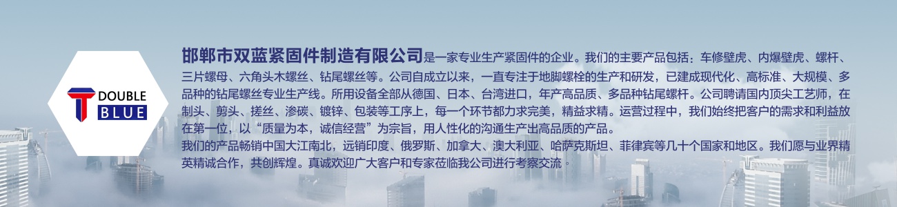 邯郸市双蓝紧固件制造有限公司是一家专业生产紧固件的企业。我们的主要产品包括:车修壁虎、内爆壁虎、螺杆、三片螺母、六角头木螺丝、钻尾螺丝等。 公司自成立以来,一直专注于地脚螺栓的生产和研发,已建成现代化、高标准、大规模、多品种的钻尾螺丝专业生产线。所用设备全部从德国、日本、台湾进口,年产高品质、多品种钻尾螺杆。 公司聘请国内顶尖工艺师,在制头、剪头、搓丝、渗碳、镀锌、包装等工序上,每一个环节都力求完美,精益求精。 运营过程中,我们始终把客户的需求和利益放在第一位,以“质量为本,诚信经营”为宗旨,用人性化的沟通生产出高品质的产品。 我们的产品畅销中国大江南北,远销印度、俄罗斯、加拿大、澳大利亚、哈萨克斯坦、菲律宾等几十个国家和地区。 我们愿与业界精英精诚合作,共创辉煌。真诚欢迎广大客户和专家莅临我公司进行考察交流。