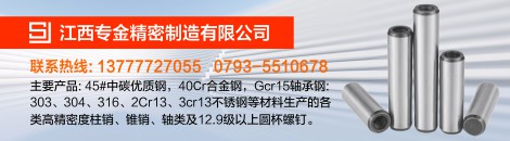 江西专金精密制造有限公司是一家自主研發、生產、銷售、營運為一體的專業性生產企業。我们目前是国内生产销轴最大的公司之一,目前占地面积就有24000平方米,主要產品有45#中碳优质钢;40Cr合金钢;Gcr15轴承钢;303、304、316、2Cr13、3Cr13不锈钢等材料生產的各類高精密度柱銷、錐銷、軸類及12.9級以上圓杯螺釘。 我们公司所有产品都是按国标标准制做,12.9级,产品材质一般为45#钢、40cr、Gcr15、硬度一般在38°-46°之间,Gcr硬度为58°-62°公差:m6(柱销) ,h10(1:50锥销)表面磨光、常规直径3-50规格全部都有现货。对于产品质量精度、光洁度您可以绝对放心,非标可定制,支持检测。 详情咨询热线:18179379110