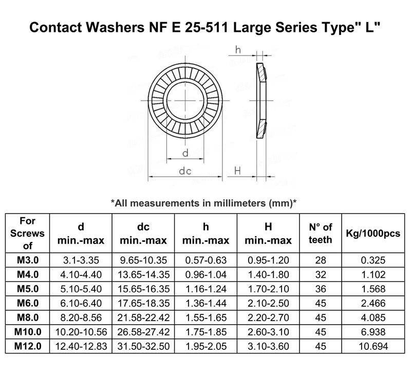 锥形半印花垫圈NFE25-511 L 宽型 304SS,65MN 材料:不锈钢,65MN,弹钢,弹簧钢,黄铜.... 表面:镀锌(蓝白,黄),发黑,达克罗、机械镀锌、久美特... 规格: M1.6-M30 所有尺寸 我司另外还专业生产内外齿锁紧垫圈DIN6797,扣紧螺母DIN7967,锥形弹簧垫圈DIN6796,波形和鞍形弹簧垫圈DIN137,内外锯齿锁紧垫圈DIN6798,锥形弹簧垫片DIN2093...等德标垫圈和锥形双面斜印花垫圈DIN9250,美标内外齿垫圈ASME.B18.21.1. 我司可根据客户图纸定做冲压件, 欢迎广大新老客户来图来样咨询和加工.