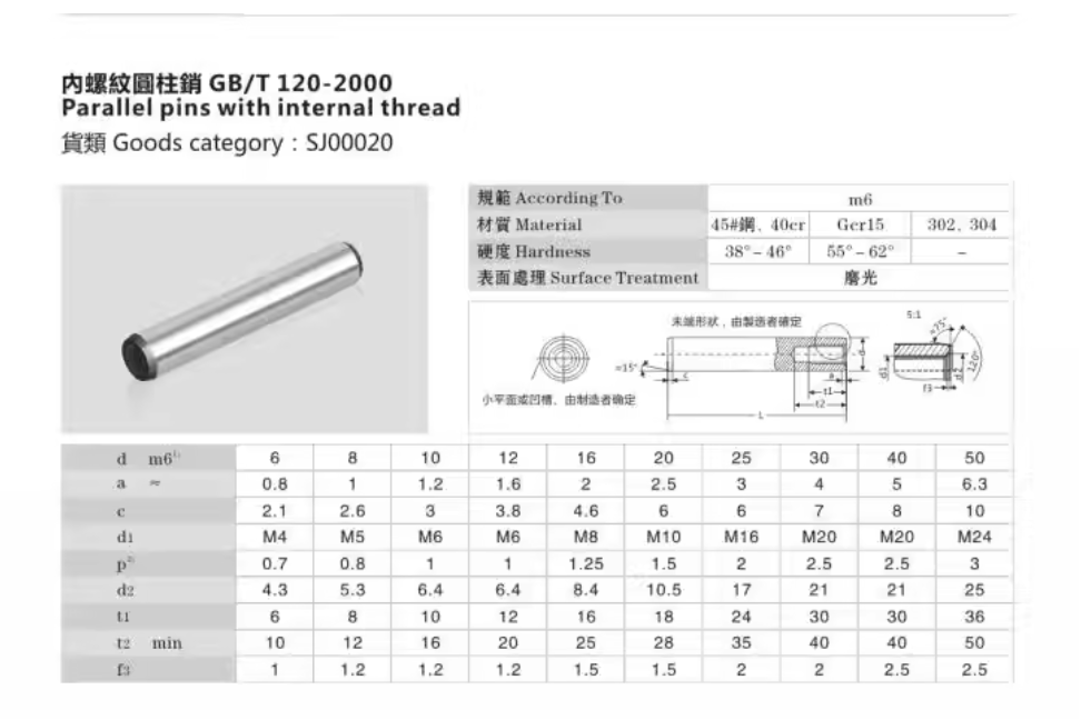 攻牙销拔销模具销厂家 内螺纹高强度定位销GB120.2 品牌:SJ 型号:GB120.2-2000 HRC:硬度:38-46 公差:m6正公差 精密度:高精密 光洁度:高光洁度 表面处理:磨光本色 使用场景:夹具上的产品定位装置,机械制造,汽车工业,模具,轴承等 专金精密制造有限公司是一家自主研發、生產、銷售、營運為一體的專業性生產企業。我们目前是国内生产销轴最大的公司之一,目前占地面积就有24000平方米,主要產品有45#中碳优质钢;40Cr合金钢;Gcr15轴承钢;303、304、316、2Cr13、3Cr13不锈钢等材料生產的各類高精密度柱銷、錐銷、軸類及12.9級以上圓杯螺釘。 我们公司所有产品都是按国标标准制做的,产品材质一般为45#钢、40cr、Gcr15、硬度一般在38°-46°之间,Gcr硬度为58°-62°公差:m6 表面磨光、常规直径3-50规格全部都有现货。对于产品质量精度、光洁度您可以绝对放心,非标可定制,支持检测。 咨询热线:18179379110